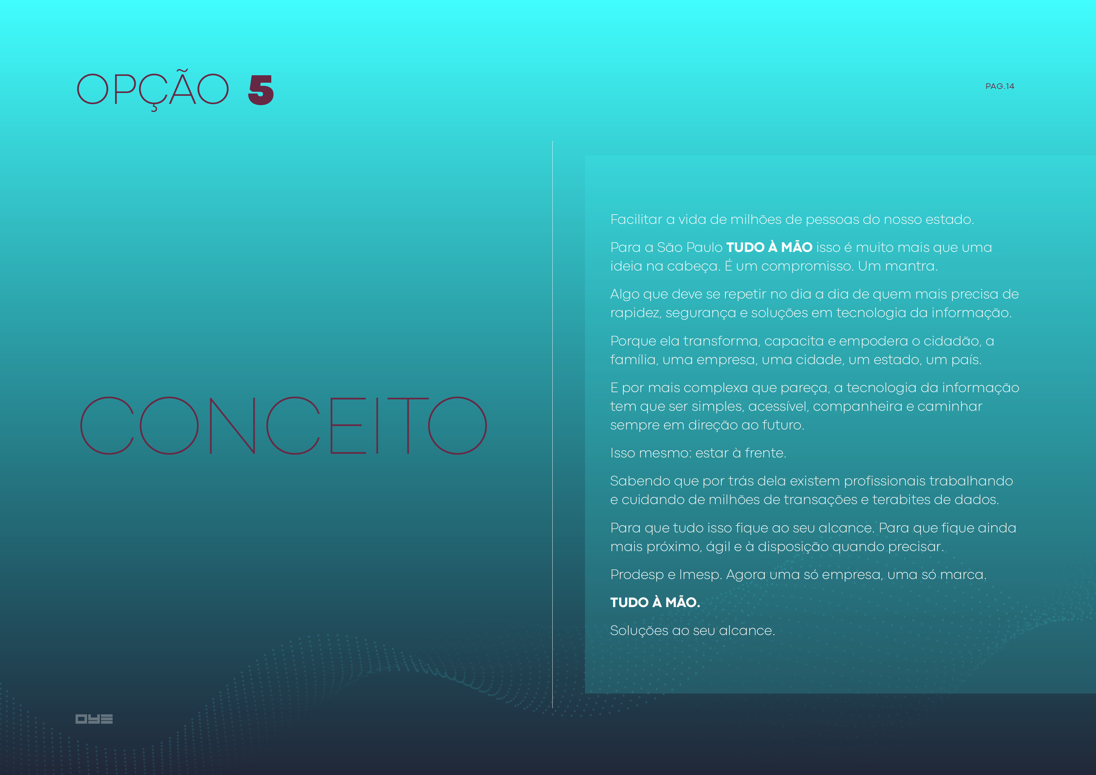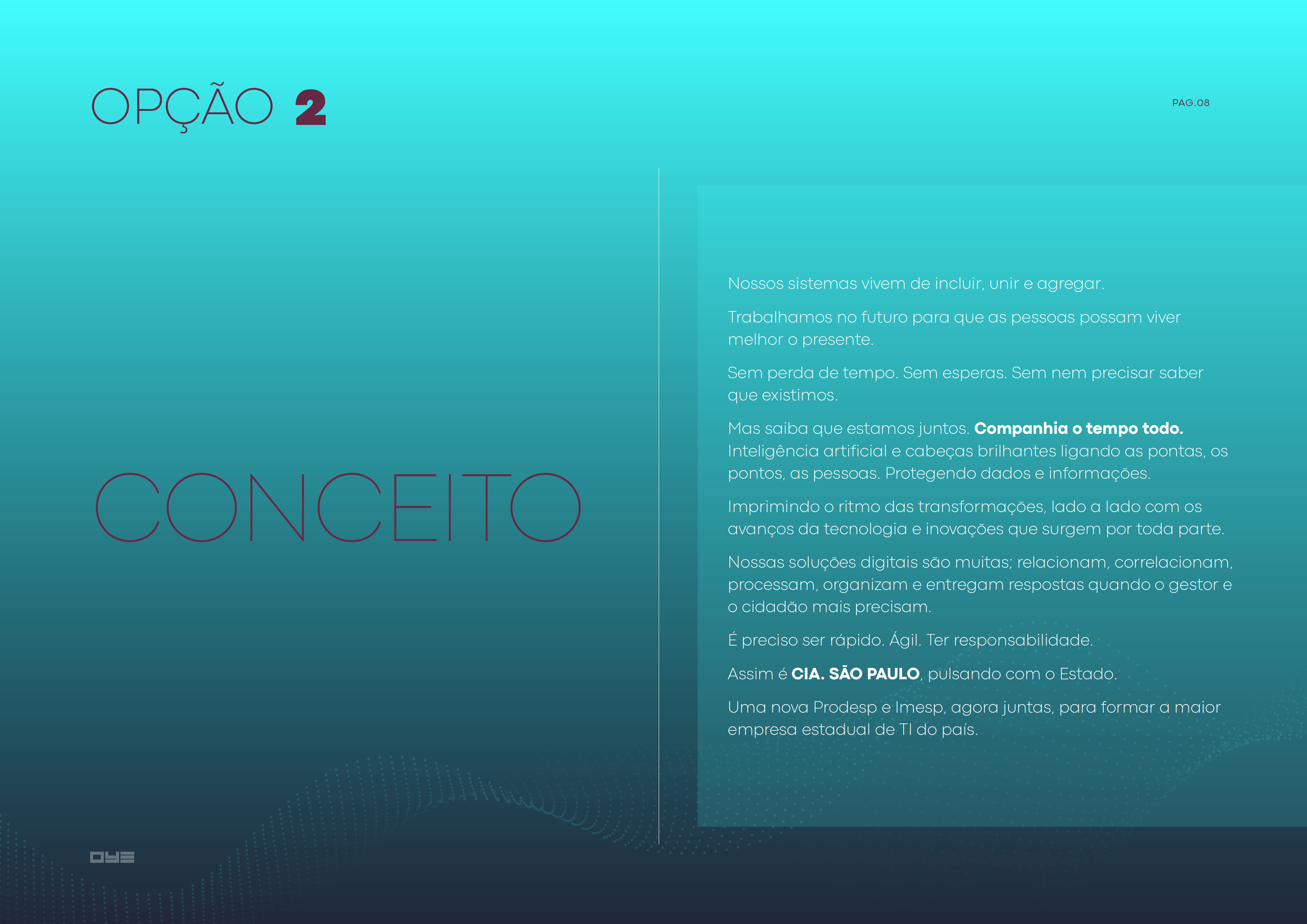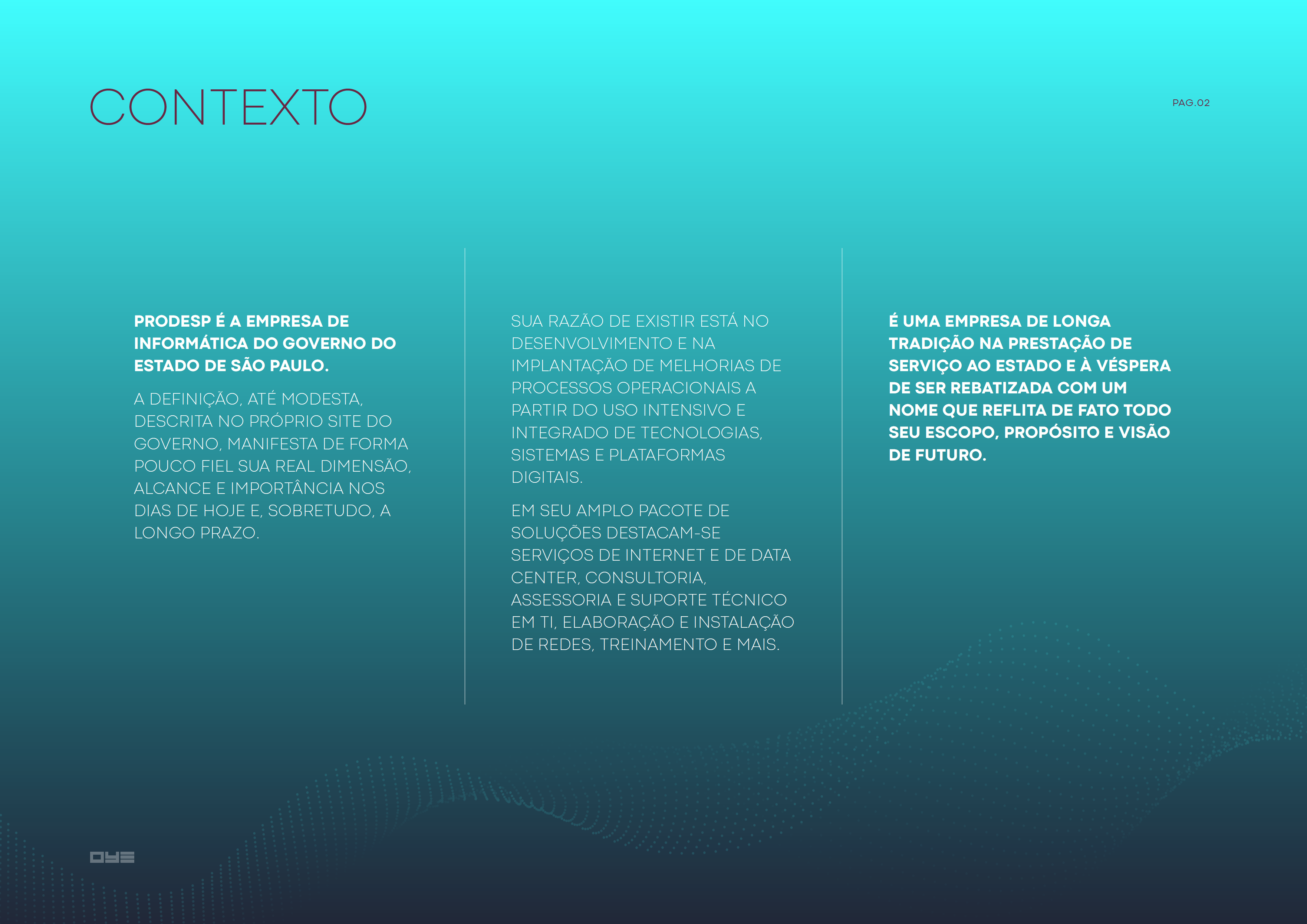 Desenvolvimento de conceito. Direção de arte. Naming. Logo. Identidade visual. Trabalho em parceria com os criativos Murilo Moregola e Theo Vieria. Ao fim do processo o Governador do Estado de São Paulo, João Doria, decidiu manter o nome Prodesp – o que ensejou a criação de novo logo e identidade visual, também a cargo da Oye. Para fins de ilustração, das opções vistas abaixo, o logo Cia. São Paulo foi selecionado para mockups.