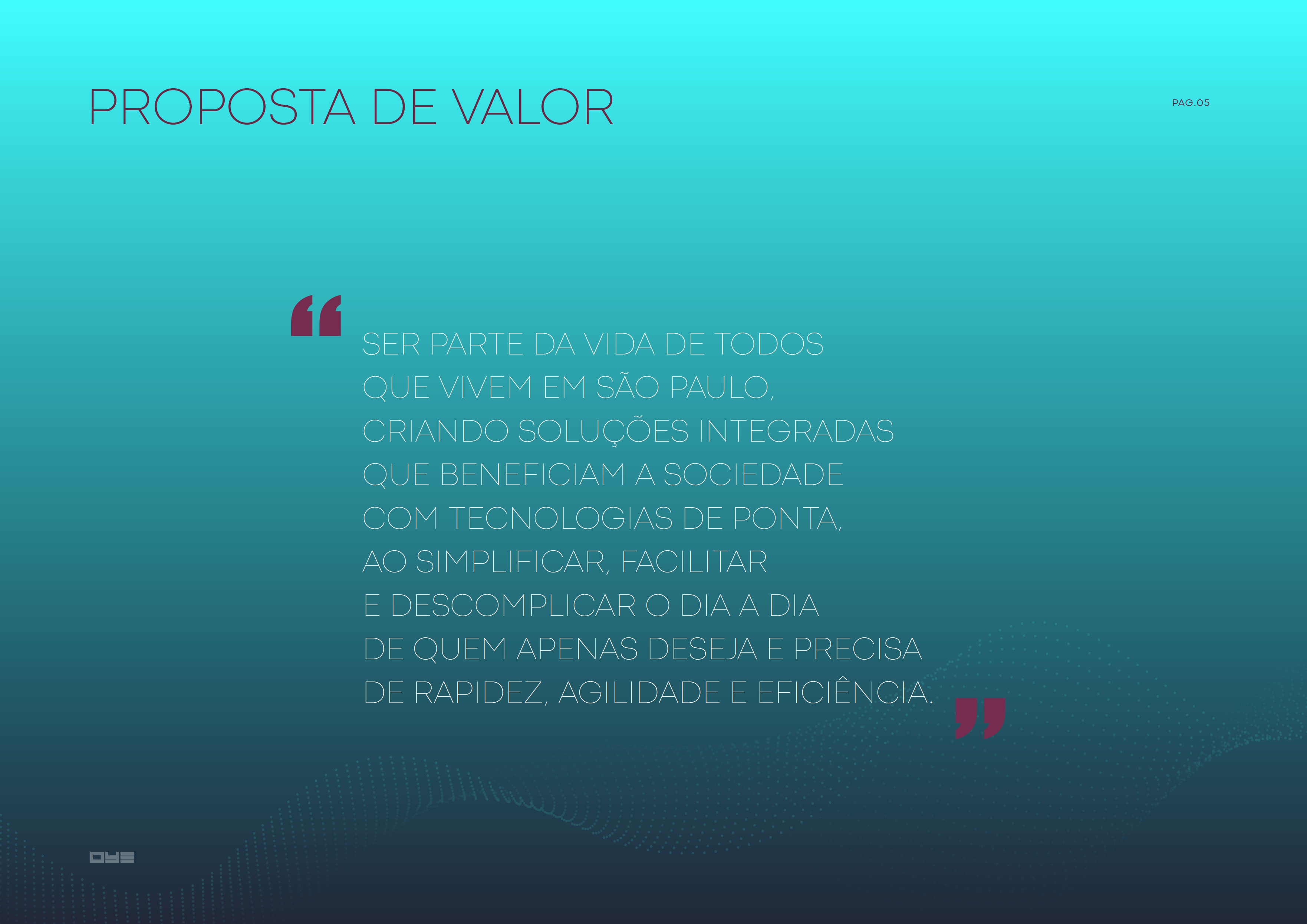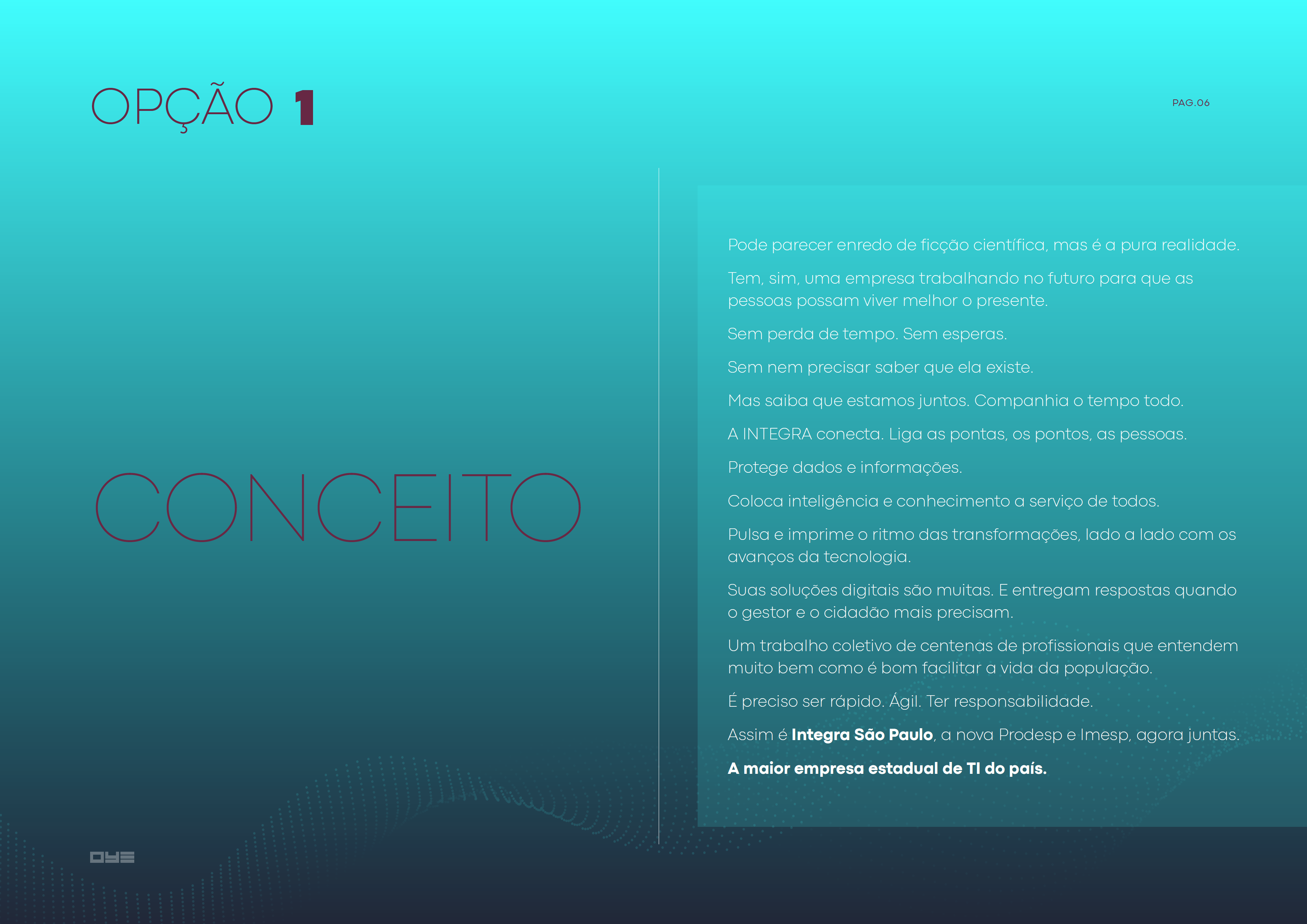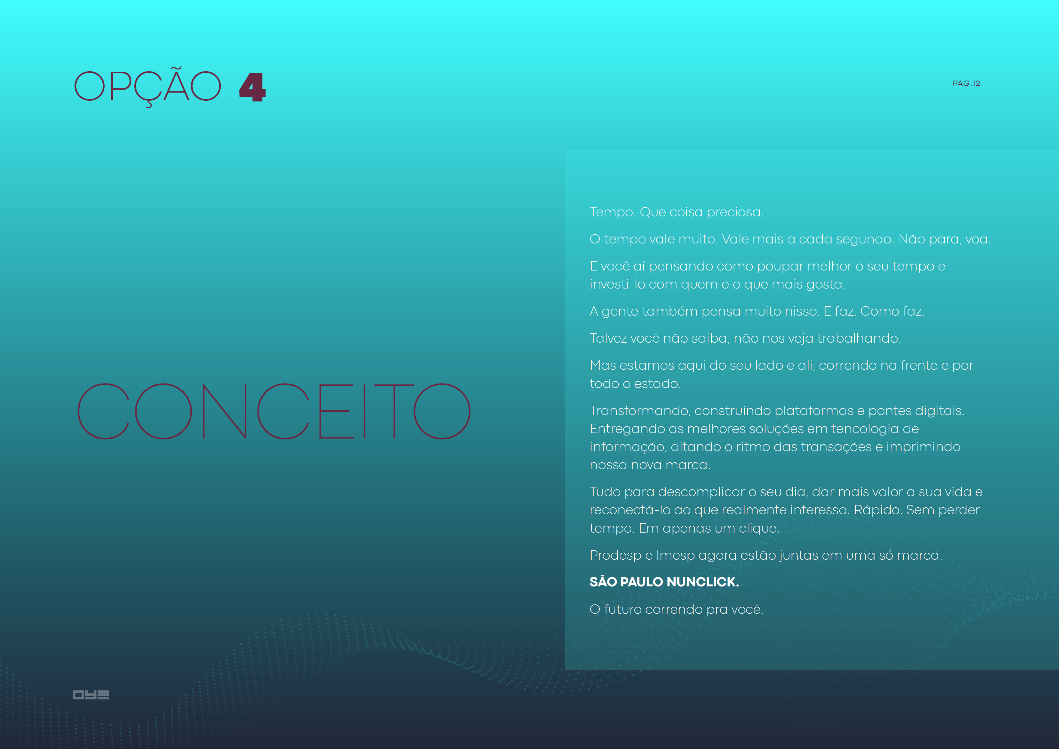 Desenvolvimento de conceito. Direção de arte. Naming. Logo. Identidade visual. Trabalho em parceria com os criativos Murilo Moregola e Theo Vieria. Ao fim do processo o Governador do Estado de São Paulo, João Doria, decidiu manter o nome Prodesp – o que ensejou a criação de novo logo e identidade visual, também a cargo da Oye. Para fins de ilustração, das opções vistas abaixo, o logo Cia. São Paulo foi selecionado para mockups.