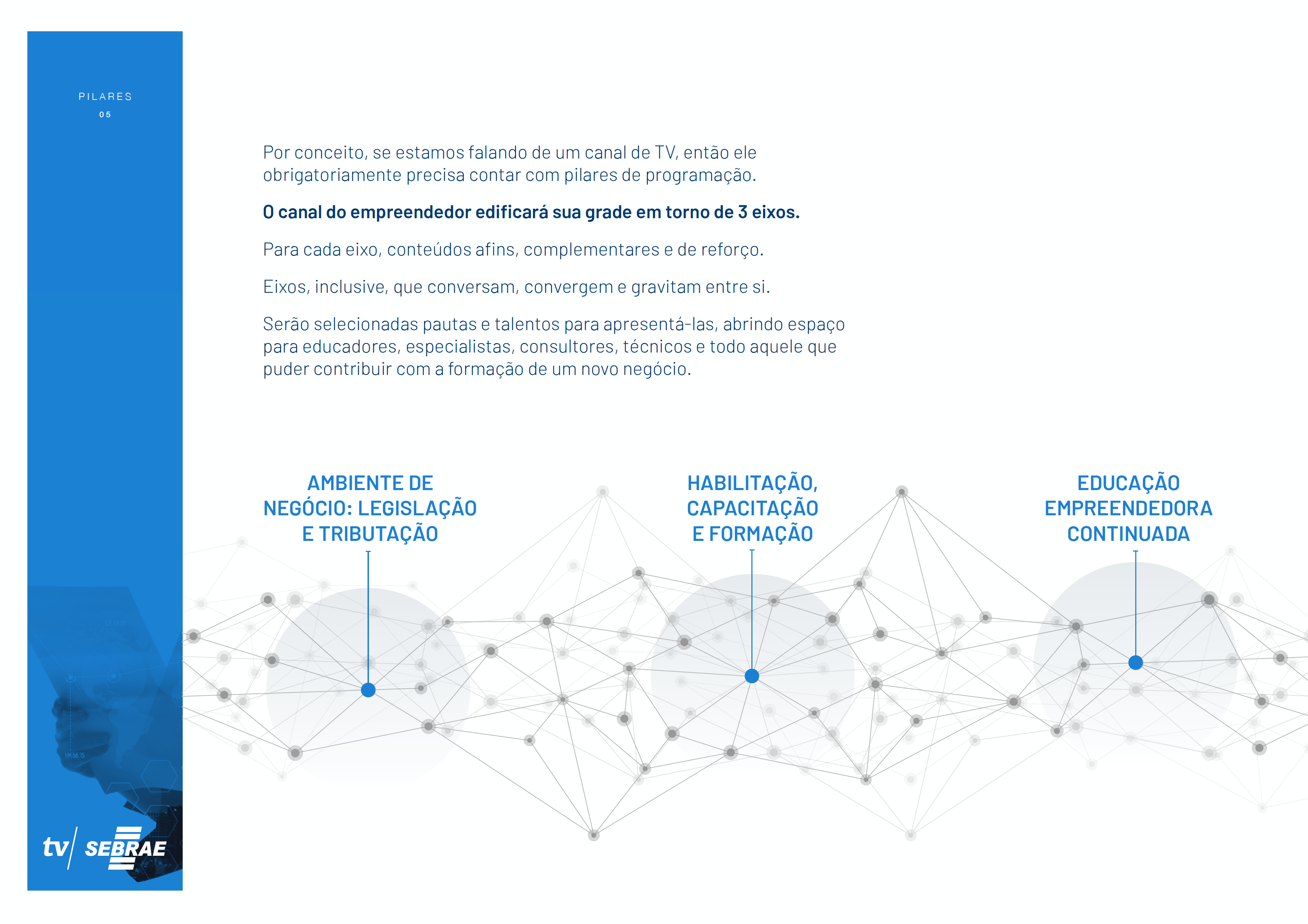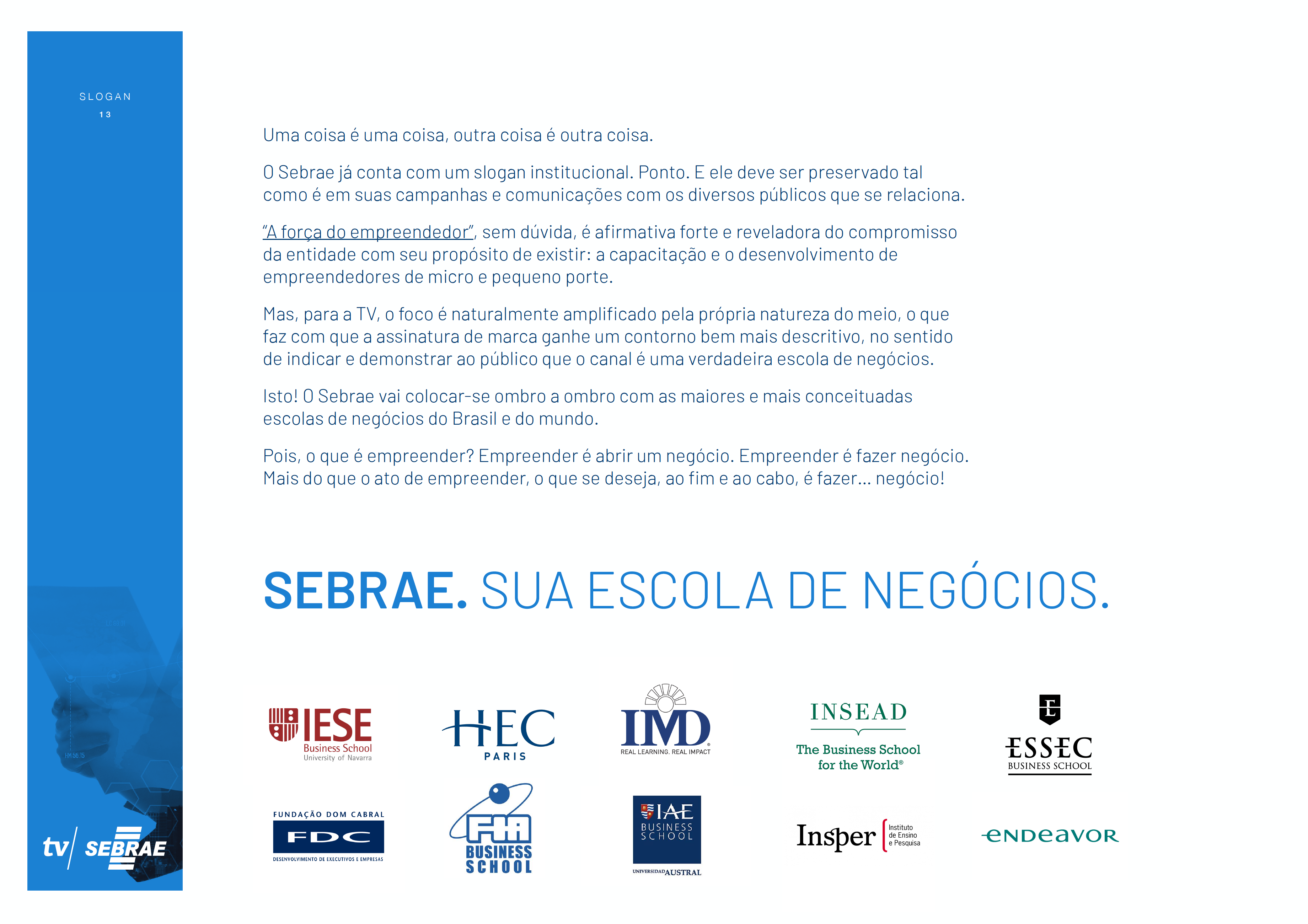 Desenvolvimento de projeto de criação de novo canal de televisão por assinatura. Programadora Newco, Grupo Bandeirantes. TV Sebrae, Conceito. Argumento. Logo. Identidade visual. On air look.