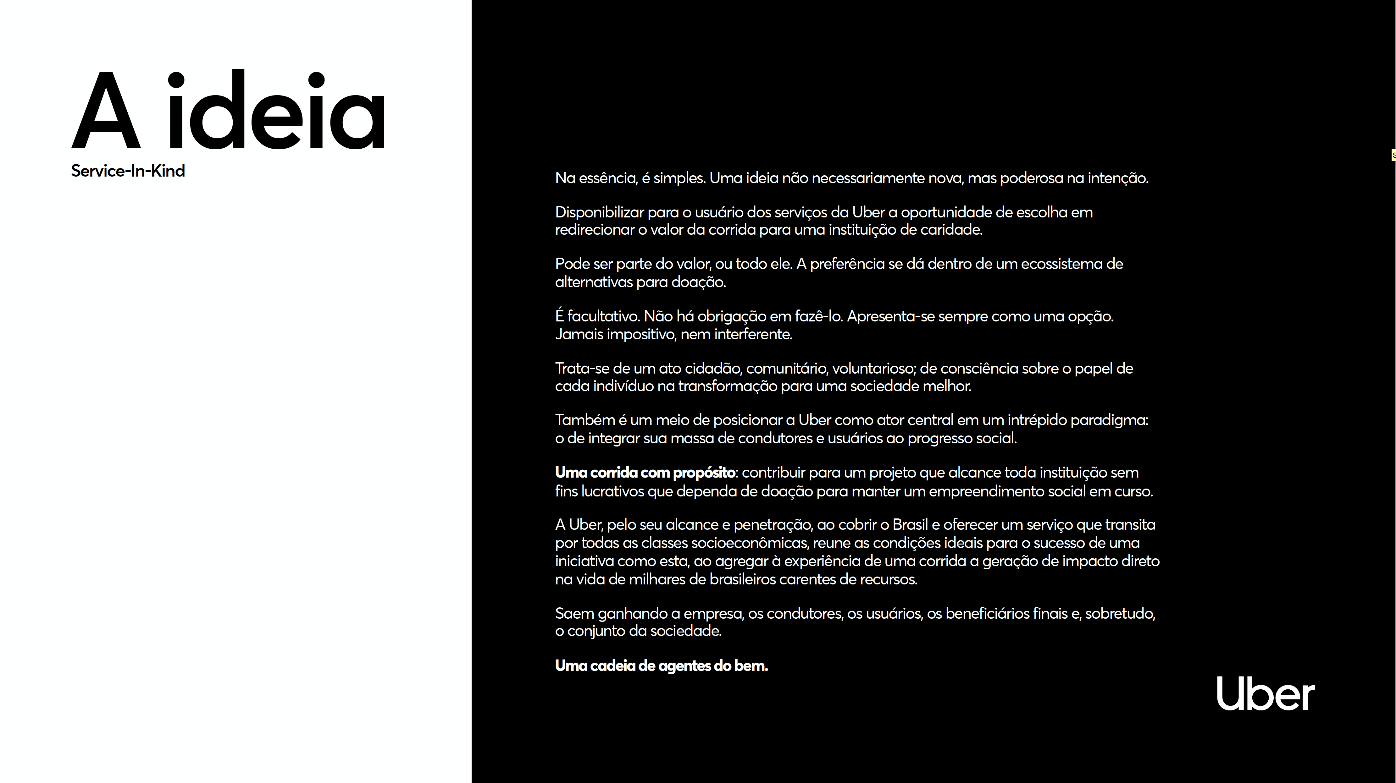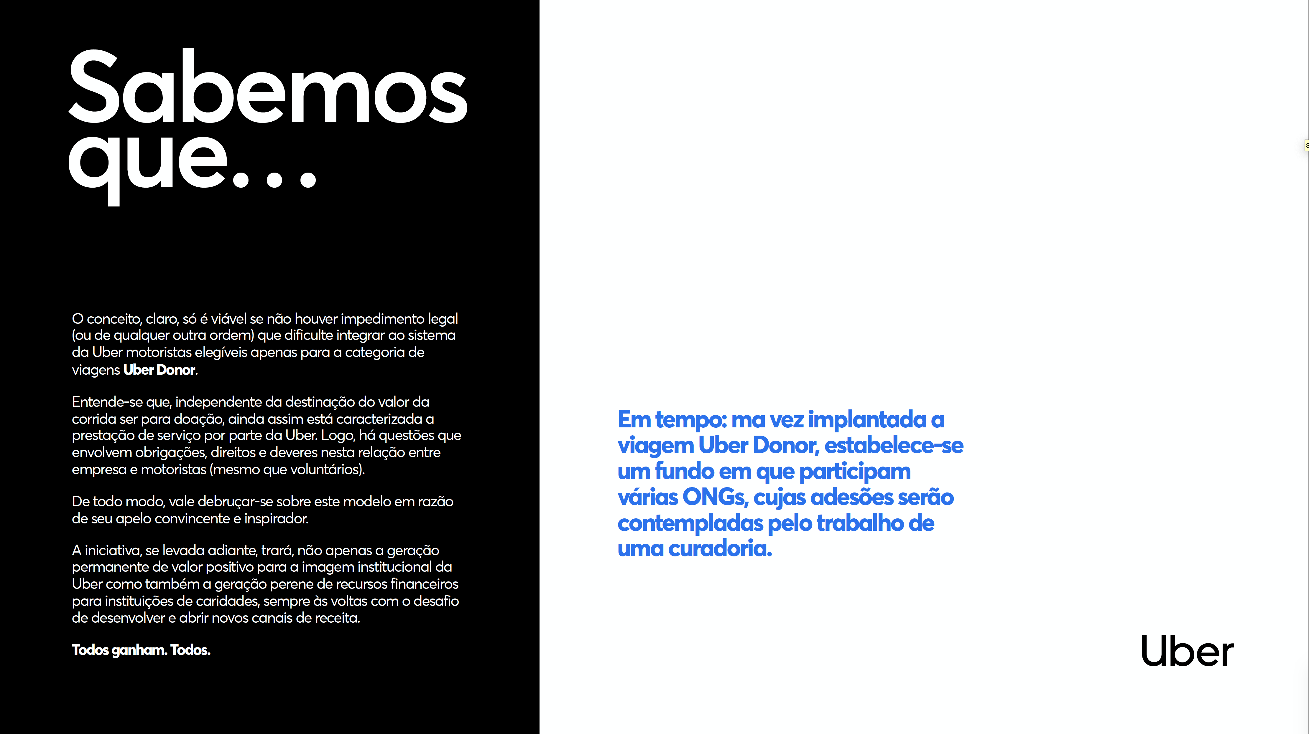 Argumentação, textos, desenvolvimento de projeto comercial e direção de arte. Conceito original de autoria de Carlito Gini. Versões adaptadas para 99 TÁXI e CABIFY. Projeto ainda à mesa de negociação.